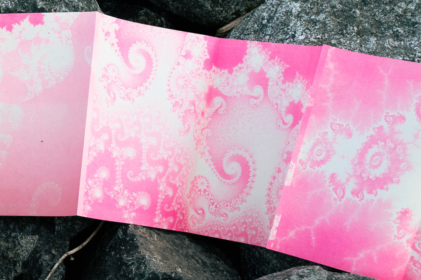 Entering the Mandelbrot Set is a concertina zine consisting of drawings made during a workshop where we explored the Mandelbrot set and fractals through interactive websites, tracing over repeated lines and shapes. On one side, you can see the drawings and on the other side are examples of fractals and the Mandelbrot set.